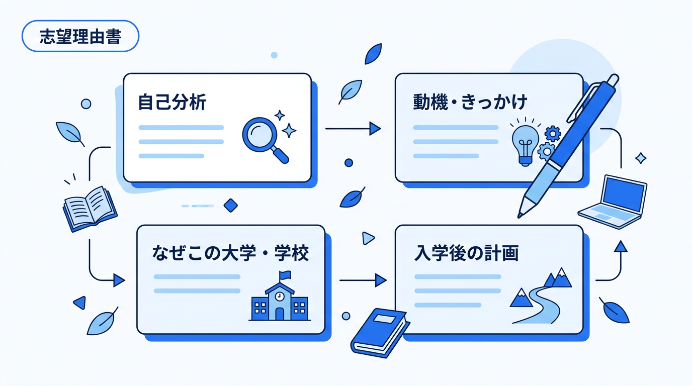 志望理由書の書き出しが決まらない高校生へ。体験型・問題提起型・志宣言型の3つの型と、法学部・看護学部・経済学部など学部別の例文10本、NG例5つのビフォーアフター付きで解説。