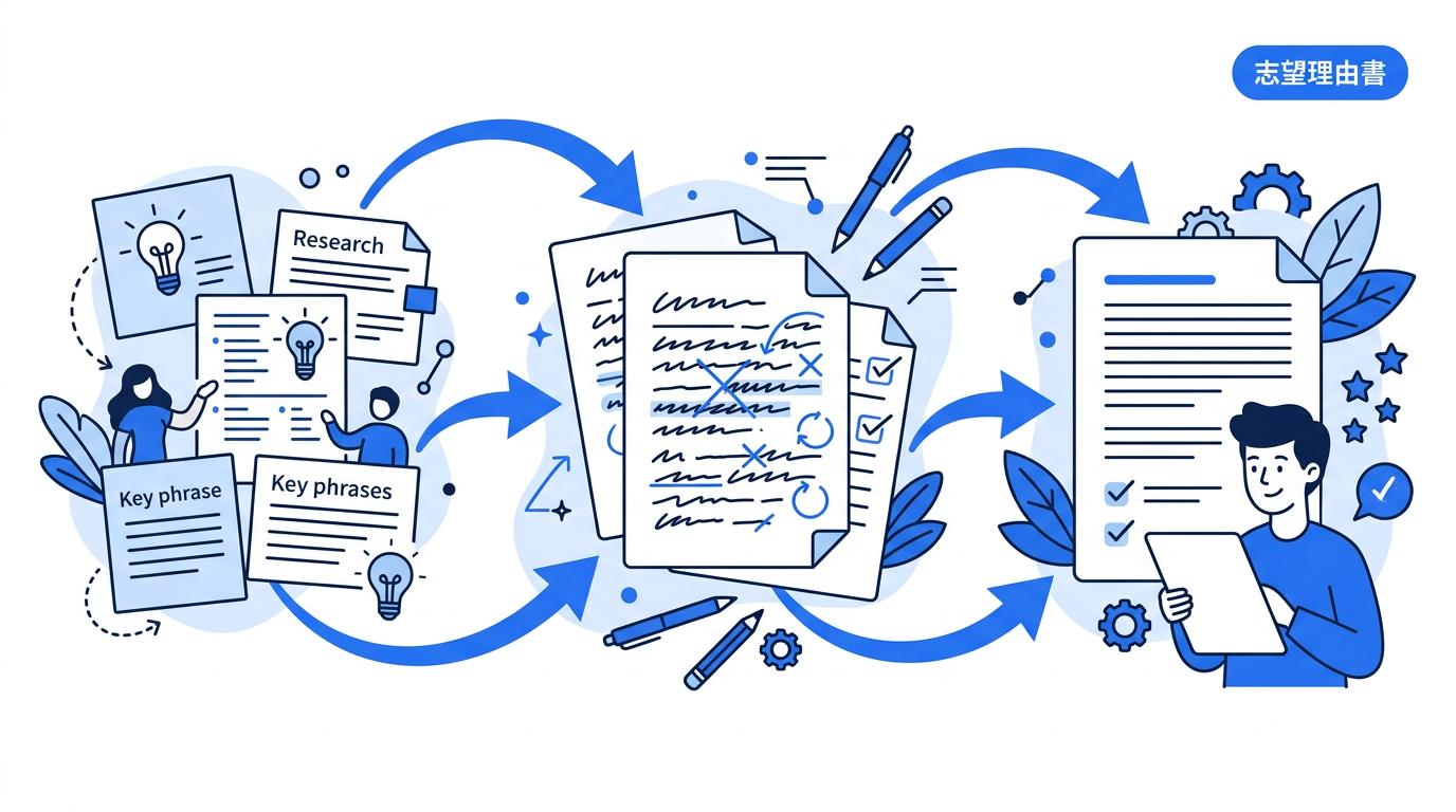 志望理由書800字が書けない高校生へ。4段落構成の配分目安、法学部・商学部・理工学部など学部別例文6本、字数を削るテクニック、NG例のビフォーアフターを具体的に解説。